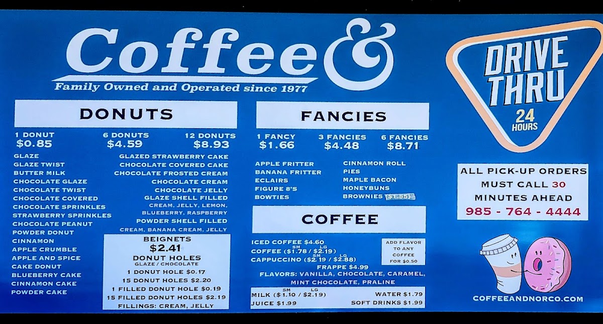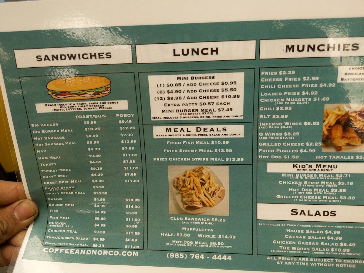 The menu at Coffee & offers a delightful range of options to satisfy various tastes, whether you're stopping by for a quick meal or a leisurely breakfast. For meal deals, patrons can enjoy a Fried Fish Meal, Fried Shrimp Meal, or Fried Chicken Strips Meal, all of which provide hearty portions. Those in the mood for a sandwich can try the classic Club Sandwich or the flavorful Muffuletta. Kids are well taken care of with options like the Chicken Strip Meal, Hot Dog Meal, and Grilled Cheese Meal. The salad selection includes fresh choices such as the House Salad, Caesar Salad, and the more substantial Chicken Caesar Salad and The Works Salad. Coffee lovers will appreciate the variety of beverages, from the simple Coffee to indulgent options like Chocolate, Cappuccino, and refreshing Iced Coffee. For a satisfying breakfast, try the 1 Egg or 2 Eggs sandwiches, or the savory Meat And Eggs or Biscuit With Gravy. The Omelette menu offers options such as the classic Cheese Omelette, Meat And Cheese Omelette, and the loaded Western Omelette and Supreme Omelette. Sides like Hot Sausage, Grits, and extra eggs are available to complement any meal. Beverages include refreshing Milk, Juice, and even Beer for those looking to unwind. For a sweet treat, choose from a variety of Donuts, including Glaze, Chocolate Glaze, and Chocolate Twist, along with decadent Apple Fritter and Eclairs. Don’t miss out on the Big Burger or its accompanying meal, or the popular Hot Sausage options. Whether you're in the mood for a light bite or a filling meal, the menu at Coffee & offers something for everyone.